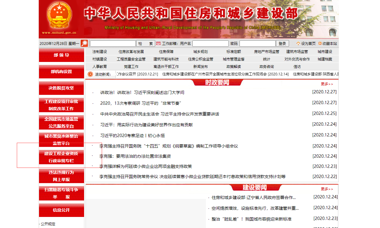 二 第二部 首頁點擊左側(cè) 建設(shè)工程企業(yè)資質(zhì)行政審批專欄 (如下圖,紅色選框部分)
