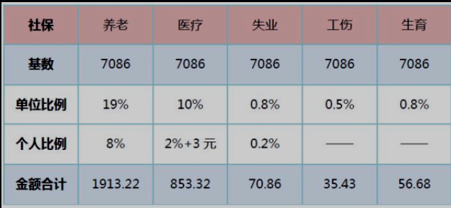 其次,這里的繳費(fèi)基數(shù)都是按照下限執(zhí)行的,比如養(yǎng)老和失業(yè)的繳費(fèi)基數(shù)下限是社平工資的40%,也就是7086×40%;而醫(yī)療、工傷和生育的繳費(fèi)基數(shù)下限是社平工資的60%,也就是7086×60%。