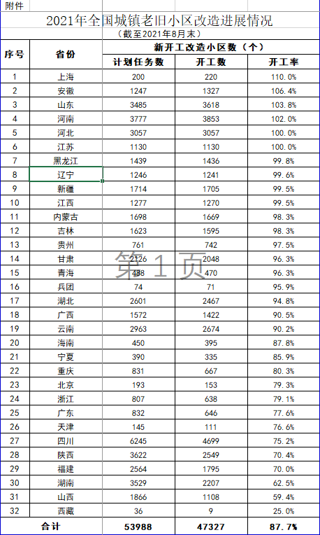 2021年1- 8月份,全國新開工改造城鎮老舊小區4.73萬個,占年度目標任務的87.7%。較7月末增加了9.5個百分點。其中,開工進展較快的地區:上海(110.0%) 、安徽(106.4%)、山東